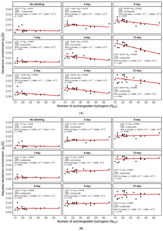 Scatter plots of pX(t) (the y-axis) versus NEH (the x-axis) across various labeling time points: (A) before adjustment for peptides for the murine CH60 protein. Each subplot corresponds to a distinct labeling duration (time point) and shows a consistent negative dependency. Red lines represent the linear regression of pX(t) on NEH. This persistent trend implies that pX(t) values are systematically biased by NEH and can propagate systematic error into turnover rate calculations. (B) After adjustment for peptides of the murine CH60 protein. Each subplot depicts pX(t) values after post hoc adjustment, showing a flat (zero-slope) relationship with NEH. Red lines indicate linear regression fit, demonstrating successful removal of NEH-dependent bias.