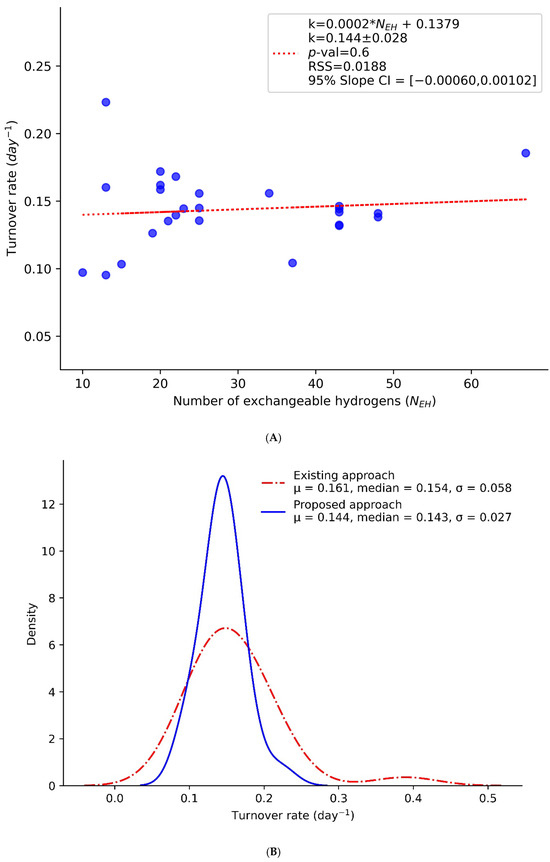 The adjustment of pX(t) propagates forward to the estimation of turnover rates, as shown in Figure 4A. The figure shows the turnover rates (y-axis) of peptides as a function of their NEH values (x-axis). The adjusted turnover rates do not depend on NEH values in the peptides of the murine CH60 protein, unlike the dependency observed in Figure 2. This approach has significantly reduced the variability in turnover rates among the constituent peptides of the protein. As shown in Figure 4B, the standard deviation of the peptides’ turnover rates decreased by more than 50%, dropping from 0.058 to 0.027 after implementing the proposed method. This improvement will enhance the confidence intervals and statistical significance of the estimated turnover rates for the protein. We note that even though the modeling presented in this work is based on a mathematics rather than a physics rationale, the interpretations of the resulting turnover rates (from Equation (7)) and excess enrichment in deuterium are the same as in the original approach. Thus, despite the transformations used in the kinetic equation, Equation (7), the resulting pX(t) values are representative of the body water enrichment, as seen in Figure 3B.