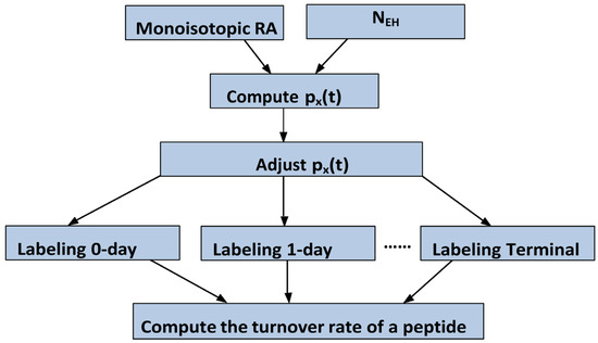 The flowchart of our approach is shown in Figure 5. It has two main steps for each peptide: (1) removal of the dependence of the excess enrichment in deuterium, pX(t), on NEH at every labeling time; (2) modeling peptide/protein turnover rates using the time course of the ratio (pX(t)/NEH) of the excess enrichment in deuterium to NEH, Equation (7).