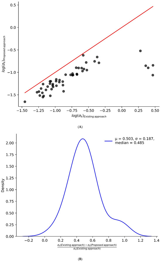 The proposed computational approach significantly reduces intra-protein variability. (A) Scatter plot comparing the standard deviation of protein turnover rates estimated using the existing method (x-axis) and the proposed method (y-axis). Most points fall below the unity line, indicating a reduction in variability with the proposed approach. (B) A density plot shows the relative difference in standard deviation between the two methods, further demonstrating the overall decrease in intra-protein variability.