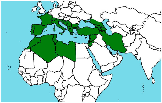 Species belonging to the genus Cistus are primarily distributed throughout the Mediterranean Basin, although their range extends from the Canary Islands and Madeira, across the Mediterranean region, to the Caucasus, Israel, and northern Africa [1,11]. These plants are considered pioneer species, capable of colonizing early successional habitats, particularly in areas affected by soil degradation resulting from overgrazing, wildfires, or other environmental disturbances [2,3]. The distribution of selected species from the genus Cistus is presented in Table 1 and Figure 1.