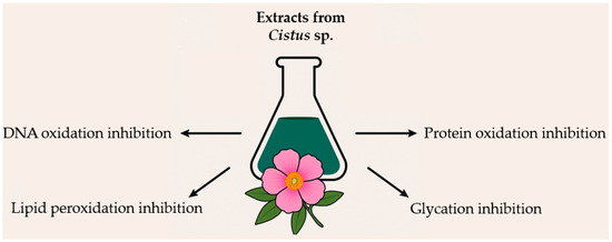 The antioxidant and antiglycation effects of Cistus sp. underscore their potential as natural agents in managing oxidative stress and mitigating molecular damage. These plants effectively reduce lipid, protein, and DNA oxidation, enhance antioxidant capacity, and inhibit glycation processes (Figure 2). Although much of the current evidence stems from in vitro and animal studies, emerging data suggest promising applications of Cistus-based preparations in oxidative stress-related health interventions. However, further research is needed to confirm these effects in well-designed clinical trials. Additionally, the standardization of Cistus extracts and assessment of their bioavailability remain key challenges that should be addressed to ensure the consistent efficacy and safety of Cistus-based preparations.