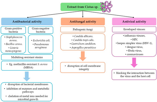 Numerous in vitro studies have confirmed the high efficacy of extracts from species such as C. incanus, C. creticus, C. ladanifer, and C. monspeliensis against a wide range of pathogenic bacterial strains. This activity encompasses both Gram-positive bacteria (e.g., Staphylococcus aureus, Bacillus cereus, Listeria monocytogenes) and Gram-negative bacteria (e.g., Escherichia coli, Pseudomonas aeruginosa) [71,74,75,76,77]. The ethanolic extract of C. ladaniferus exhibited antibacterial activity against both Gram-positive and Gram-negative bacteria, notably due to its high content of gallic acid and rutin, with inhibition zones up to 17 mm against Bacillus subtilis [78].