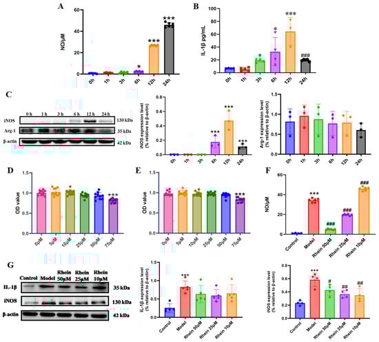Activated microglia are the main source of proinflammatory cytokines that damage neurons in the brain []. In order to facilitate the exploration of the mechanisms underlying the role of rhein in microglia-mediated neuroinflammation, we conducted research at the cellular level. We first established an inflammation model of M1 activated microglia. BV2 cells were stimulated with LPS at different time points, and the markers of M1 activation, including IL-1β, iNOS, and NO, and the marker of M2 activation, Arg-1, were detected []. The results showed that the NO increased significantly with time (Figure 2A). The expression levels of IL-1β (Figure 2B) and iNOS (Figure 2C) were the highest at 12 h (p < 0.001). The expression level of Arg-1 was not significantly different within 24 h (Figure 2C). According to the expression levels of M1 and M2 activation markers, LPS stimulation for 12 h was investigated to establish the model of M1 microglia.