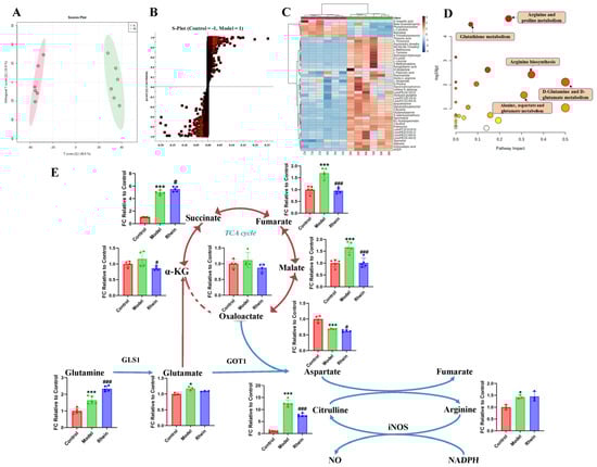 Regulatory effect of rhein on metabolism of activated M1 microglia. (A) OPLS-DA of primary microglia between control group and LPS group (R2 = 0.993, Q2 = 0.961). (B) S-Plot of primary microglia between control group and LPS group (VIP > 1, p < 0.05). The square pattern with a red border represents VIP > 1 and p < 0.05. (C) Differential metabolites of primary microglia between control group and LPS group. (D) Differential metabolite pathway of primary microglia between control group and LPS group. Node colors are based on P-values, with red ranging from light to dark and P-values ranging from large to small. The size of a node is based on its path influence value, from small to large, and from small to large in influence value. (E) The levels of metabolites of the glutamine–aspartate–arginine metabolic pathway in primary microglia. Compared with the control group, *** p < 0.001, * p < 0.05, compared with the model group, ### p < 0.001, # p < 0.05.