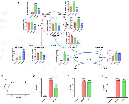 Glutamine metabolism regulates downstream aspartate biosynthesis and regulates the production of inflammatory mediator NO. (A) The levels of metabolites of the glutamine–aspartate–arginine metabolic pathway in primary microglia were relative to the FC value of the control group. Compared with the control group, *** p < 0.001, ** p < 0.01, * p < 0.05. Compared with the model group, ### p < 0.001, # p < 0.05. (B) The production of NO in different glutamine concentrations. The effects of BPTES (C), AOAA (D) and NPA (E) on NO production in BV2 cells. Compared with control group, *** p < 0.001. Compared with the model group, ### p < 0.001, # p < 0.05.