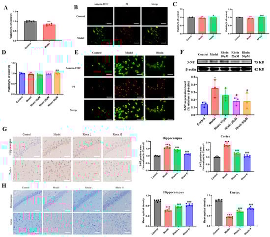 Subsequently, to explore the protective effect of rhein on BV2 microglia-mediated neuronal damage, we measured the effect of rhein on the activity and apoptosis of PC12 cells. The activity of PC12 cells in the LPS-treated medium group decreased significantly (p < 0.05), while that in the 50 μM rhein-pretreated medium group increased significantly (p < 0.01) (Figure 6D). The results of fluorescence imaging showed that the apoptosis of PC12 cells in the BV2 microglia conditioned medium group was increased by LPS, and the apoptosis level in PC12 cells in the BV2 microglia conditioned medium group was decreased by 50 μM rhein (Figure 6E). NO produced by BV2 microglia can produce 3-NT through a series of reactions, and the level of 3-NT can reflect the level of nitration stress in the brain, so we used Western Blot to determine the level of 3-NT in different groups of cells. The results showed that the level of 3-NT in PC12 cells cultured in conditioned medium of BV2 microglia treated with LPS increased significantly (p < 0.05). The level of 3-NT in PC12 cells pretreated with rhein of 25 μM and 50 μM was significantly decreased (p < 0.05) (Figure 6F). A similar phenomenon was observed in the brain of AD rats, and the 3-NT positive region decreased after rhein administration (Figure 6G). Nissl staining results showed that rhein intervention increased the number of neurons in the hippocampus compared with model rats, and the cells were closely arranged and normal in shape (Figure 6H).