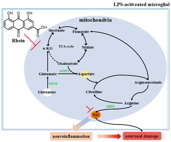 Metabolic reprogramming occurs in microglia in the LPS stimulation. In our study, the glutamine–aspartate–arginine metabolic pathway was related to inflammatory response of activated microglia. We demonstrated that rhein has a regulatory effect on this pathway. Glutamine is an important amino acid that supplies carbon and nitrogen to fuel biosynthesis []. Our results showed that LPS promoted the formation of α-KG from glutamate, which further promoted glutamine-derived metabolites from entering the TCA cycle, consequently increasing precursors for aspartate biosynthesis. This process is related to the phenotypes and functions of microglia, and is essential to the pathogenesis of AD []. After rhein treatment, the ability of glutamine to replenish the TCA cycle was reduced, and the levels of intermediate metabolites in TCA cycle were reversed. In addition, it has been reported that aspartate production is dependent on the amidogen from glutamine and the carbon skeleton from oxaloacetate in the TCA cycle []. Aspartate can partake in arginine regeneration in conjunction with citrulline for sustained NO production by iNOS of M1 microglia []. These are consistent with our results that LPS promoted the production and consumption of aspartate, and then accelerated the production of arginine and NO, supporting that aspartate biosynthesis is an important node in the glutamine–aspartate–arginine metabolic pathway. After rhein treatment, we found that aspartate biosynthesis was decreased, and the production of arginine and NO were also reduced. Therefore, our results suggest that rhein represents a potential therapeutic value for AD neuroinflammation by adjusting the glutamine–aspartate–arginine metabolic pathway.