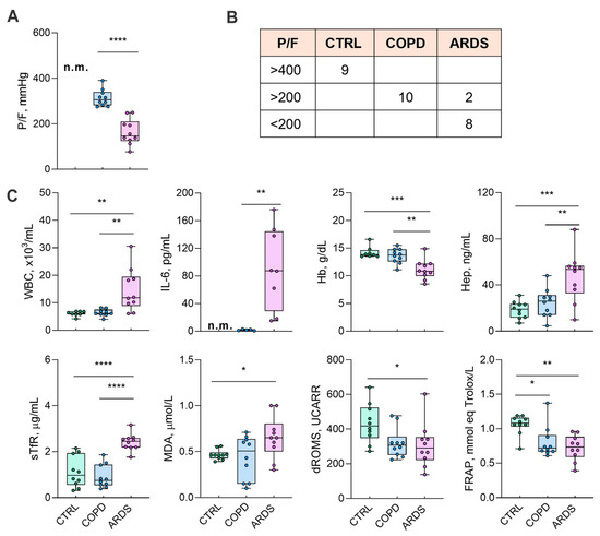 The characteristics of the groups under study. (Panel (A)) shows the P/F ratio as a marker of the lung damage due to the underlying disease. (Panel (B)) shows the distribution of P/F in the groups, while (Panel (C)) shows the biochemical markers. P/F and IL-6 values in the CTRL subjects were not measured (n.m.); a reference value of P/F > 400 was considered for the CTRL subjects according to a peripheral oxygen saturation >95% (Panel (B)). Data in (Panel (C)) were tested by one-way ANOVA followed by the Bonferroni post hoc test (if ANOVA p < 0.05) to check significant differences among groups. P/F and IL-6 data were tested by a two-tailed Student t-test (COPD vs. ARDS), excluding any evaluation of the control values. **** p < 0.0001, *** p < 0.0005, ** p < 0.005, and * p < 0.05. For abbreviations, see the list of abbreviations.