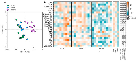The PLS-DA profile emerged from the untargeted lipidomic analysis that highlighted a marked separation vs. the lipid signature of the CTRL subjects, especially for the ARDS patients, while the differences between the COPD and CTRL groups were less evident (Figure 2A). The heatmaps in Figure 2B (left and centre) show all the subjects and the group average, respectively, for all the classes of lipids, that were identified and abbreviated as suggested [9]. The emerging trend for most of the lipids corresponds to a progressive decrease in the order CTRL > COPD >> ARDS, but for a few of them (i.e., DG, MG, and PE) the sequence is inverted with ARDS >> COPD > CTRL. Figure 2B (right) shows the direction of the change and whether the change is significant as from the ANOVA analysis followed by the Bonferroni post hoc test. Such analysis reveals statistically significant changes in thirteen lipid classes. Since the primary aim of this study was to identify lipid alterations specific to ARDS, we initially focused on the differences between ARDS patients and healthy controls (CTRL). However, to ensure that the observed changes were not simply due to chronic hypoxia, as seen in COPD, we also compared ARDS with COPD patients. To this end, we selected only those lipid classes that showed statistically significant differences in both comparisons—ARDS vs. CTRL and ARDS vs. COPD—hereinafter referred to as the most significant lipid classes. These include five lipid classes that were decreased in ARDS (CE, CoQ, PI, ST, and HexCer), and one class (PE) that was increased.