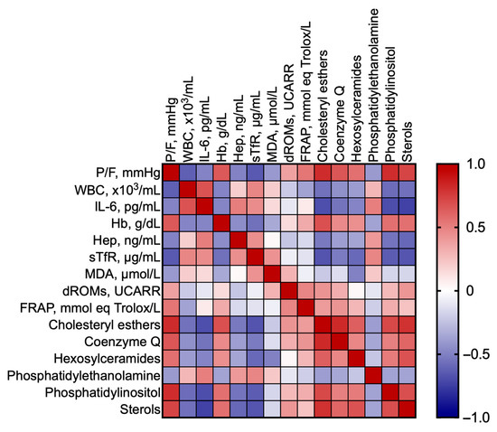 As a next step, we investigated whether the changes in the most significant lipid classes are correlated with hypoxia severity, best characterized by P/F. Table 1 shows the results of separate correlations between P/F and the biochemical markers, as well as the most significant lipid classes. It appears that P/F is significantly correlated with all the markers, except reactive O2 metabolites (dROMs, p = 0.0636) and IL-6 (p = 0.0867); nonetheless, it correlates with all the most significant lipid classes. Figure 3 shows the Pearson R correlation matrix between each pair of clinical markers and most significant lipid classes.