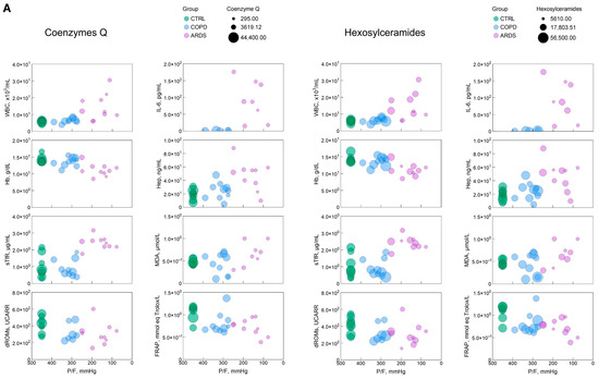 The bubble plots in Figure 4 help address the 3D relationship between hypoxia severity, the markers of the clinical panel and the most significant lipid classes. In most cases, although not all, such relationships are of the continuous type without depending on the kind of disease. This highlights that the parameters investigated here are essentially unable to discriminate between COPD and ARDS but address the severity of hypoxia independently of the causing disease.