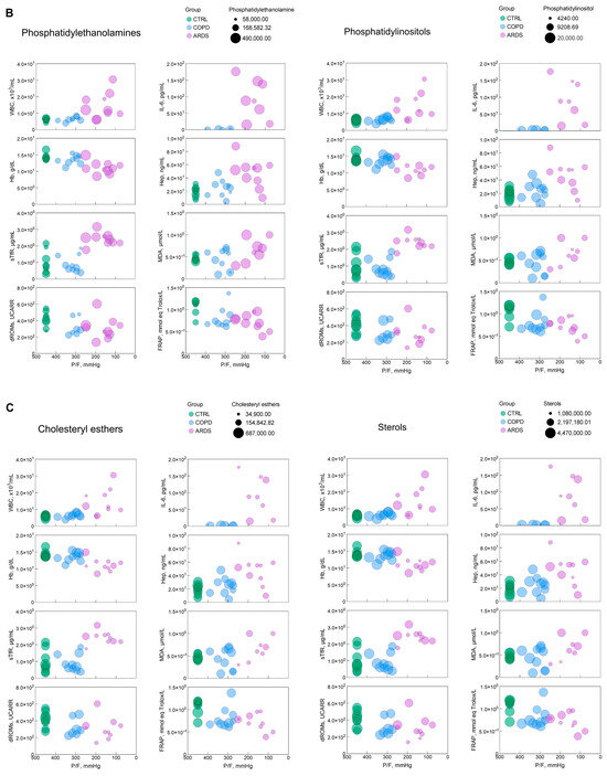 (A–C) Bubble plots representing the relationship, for each of the most significant lipid classes, between P/F, an index of the hypoxia severity, with each of the clinical and biochemical markers selected in this study. The green, blue, and pink symbols represent CTRL, COPD, and ARDS. IL-6 panels only report COPD and ARDS values, as they were not measured in the CTRL population. The size of the bubble reflects the amount of the relative lipid class as in the key in each panel. The parameters and significance levels of the linear regression fits, which are not reported here for clarity, are shown in Table 1.