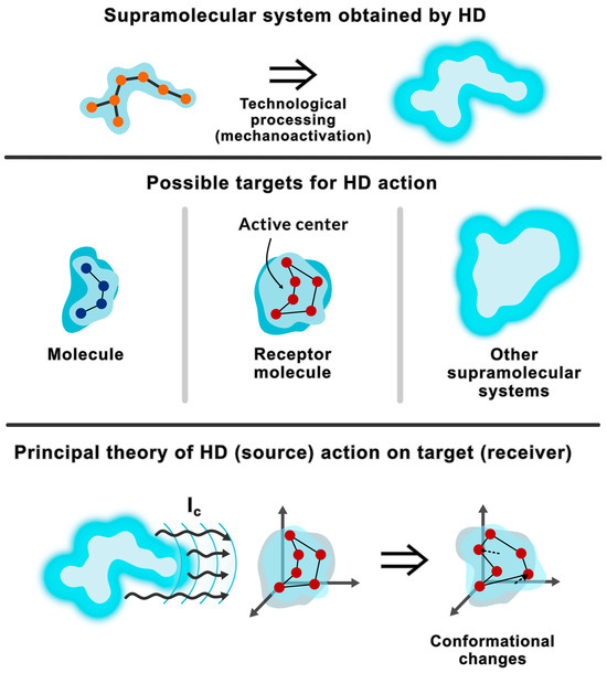 Figure 1. Schematic representation of a supramolecular system in HD aqueous solutions and the result of its DMS action on the “receiver”. Upper panel: supramolecular systems are formed in the process of self-assembly in HD aqueous solutions obtained by technological processing (including mechanical activation). Middle panel: molecules, molecular receptors, and supramolecular systems are potential targets for the action of DMS. Bottom panel: change in the conformation of the target (using the example of a molecular receptor) due to its reception of DMS from supramolecular systems: a change in the conformation of the active center in the protein molecule is shown, which leads to a change in the conformation of the entire protein molecule.