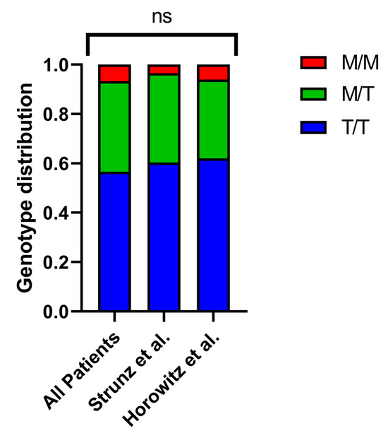 Genotype distribution of HLA-B –21 M/T dimorphism across patient cohorts. The distribution of M/M, M/T, and T/T genotypes in our study cohort and two reference populations—Strunz et al. (n = 230) [9] and Horowitz et al. (n = 8192) [12]—showed no significant differences.