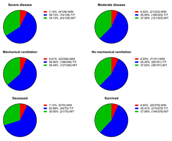 Distribution of genotypes (M/M, T/T, and M/T) according to clinical dichotomizations: disease severity (severe vs. moderate), need for mechanical ventilation (yes vs. no), and outcome (deceased vs. survived). No statistically significant differences were observed in genotype distribution among the compared groups.