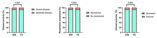 Comparison of clinical parameters between patients with M/M genotypes and those with T/X genotypes (M/T or T/T). Bars represent the percentage of patients according to disease severity (severe vs. moderate), need for mechanical respiratory support (mechanical vs. no mechanical), and clinical outcome (deceased vs. survivor). No statistically significant differences were observed between groups in any of the comparisons, as indicated by the corresponding p-values.