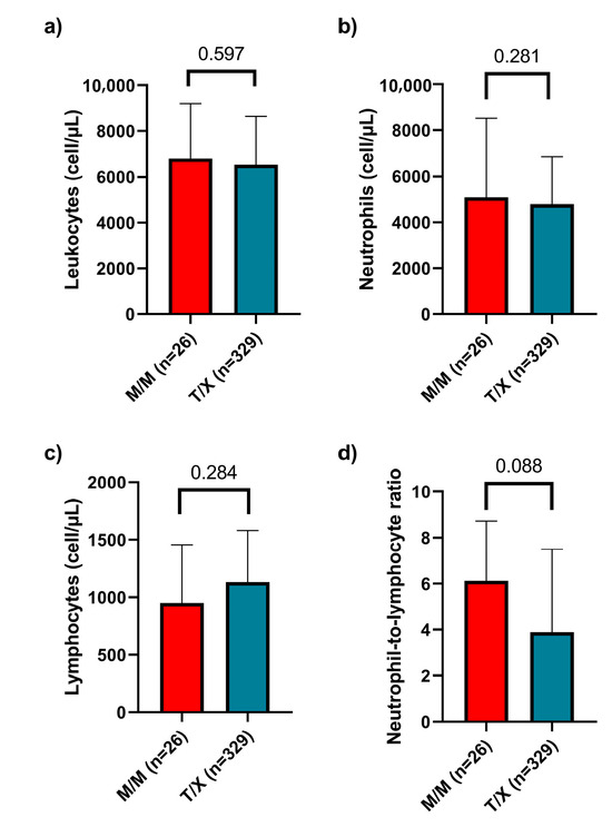 Leukocyte, neutrophil, and lymphocyte counts and neutrophil-to-lymphocyte ratio in patients with M/M versus T/X genotypes. (a) Total leukocyte count, (b) neutrophil count, (c) lymphocyte count, and (d) neutrophil-to-lymphocyte ratio were analyzed. No statistically significant differences were observed between the groups in any of the parameters evaluated. Data are presented as median and interquartile range (IQR).