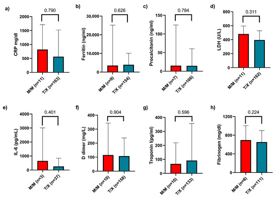 Comparison of biochemical inflammatory markers between M/M and T/X genotypes. Levels of (a) C-reactive protein (CRP), (b) ferritin, (c) procalcitonin, (d) lactate dehydrogenase (LDH), (e) interleukin-6 (IL-6), (f) D-dimer, (g) troponin I, and (h) fibrinogen were assessed. No statistically significant differences were observed between the two groups. Data are presented as median and interquartile range (IQR).
