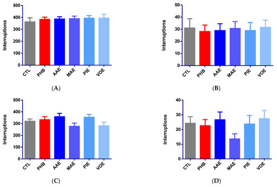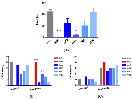 Lethality rates post-seizure were 25% in the control group and 0% in the phenobarbital group. However, this reduction was not statistically significant (p > 0.05, Fisher’s exact test). Administration of MAE and PIE resulted in lethality rates similar to those of the control (25%). AAE produced a slightly higher rate (37.5%), and VOE showed a lower rate (12.5%). However, none of these differences were statistically significant (Figure 2C).