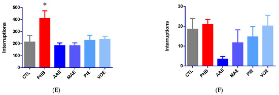Variation of motor activity in mice, expressed as a mean number of beam interruptions ± SEM. (A) Baseline horizontal movements; (B) baseline vertical movements; (C) horizontal movements on Day 7; (D) vertical movements on Day 7; (E) post-seizure horizontal movements on Day 8; (F) post-seizure vertical movements on Day 9. * p < 0.05 vs. CTL; AAE—A. archangelica ethanolic extract; PIE—P. incarnata ethanolic extract; VOE—V. officinalis ethanolic extract; MAE—M. alba ethanolic extract; CTL—Control; PHB—Phenobarbital.