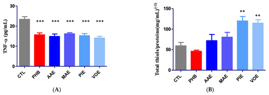 Quantification of inflammation and oxidative stress markers in mouse brain tissues. (A) Variation in TNF-α; (B) variation of total thiols/protein content. Values are expressed as mean + SEM ** p < 0.01, *** p < 0.001 vs. CTL; AAE—A. archangelica ethanolic extract; PIE—P. incarnata ethanolic extract; VOE—V. officinalis ethanolic extract; MAE—M. alba ethanolic extract; CTL—Control; PHB—Phenobarbital.