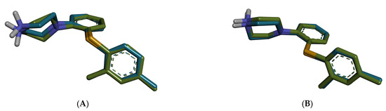 Superposition of the redocked pose (blue) of vortioxetine on experimental conformation (green). (A) mouse 5-HT3A (8AW2); (B) human 5-HT3A (8BLA).