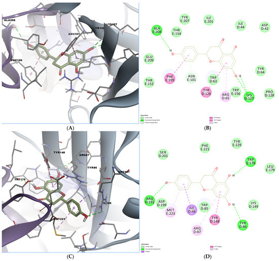 Predicted binding poses and interactions for naringenin in the 5-HT3A orthosteric binding site. (A) Docked pose in the mouse binding site; (B) 2D predicted interactions diagram between naringenin and the mouse binding site; (C) docked pose in the human binding site; (D) 2D predicted interactions diagram between naringenin and the human binding site.
