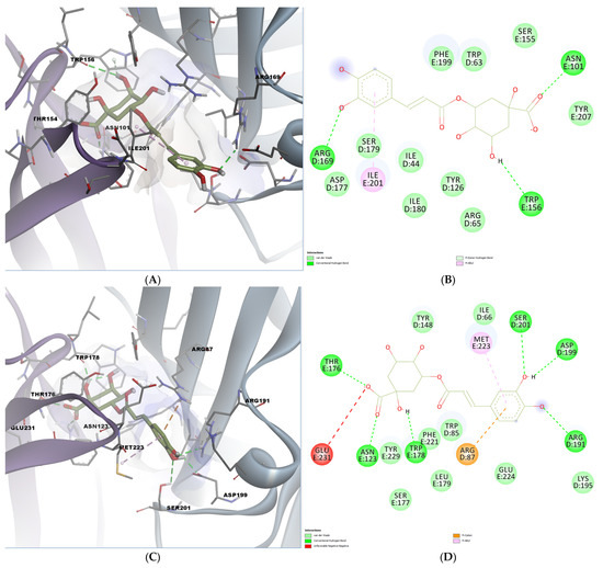 Chlorogenic acid also demonstrated high binding affinity, especially in the mouse receptor (−9.758 kcal/mol). Docking visualization revealed hydrogen bonds with key polar residues, including Arg169, Trp156, and Asn101. A pi-donor hydrogen bond was also formed with Trp156, while the chlorogenic acid engaged in a pi-alkyl interaction with Ile201 (Figure 6A,B). In the human receptor, several residues contribute to hydrogen bonding: Thr176, Asn123, Trp178, Ser201, Asp199, and Arg191. (Figure 6C,D). A polar pi-cation interaction was also formed with Arg87, while a hydrophobic interaction was observed with Met223, reinforcing the potential of chlorogenic acid as a serotonergic modulator.