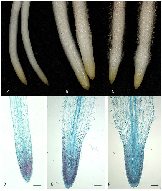 The root tips are covered with a cap, which protects the root from soil obstacles, and above the cap is the root elongation, where cell division, initial cell differentiation, and growth take place. The reduction in root size and meristem thickening shown in our study may be another symptom or cause of a disturbance in the direction of root growth (Figure 1, Figure 2 and Figure 3).