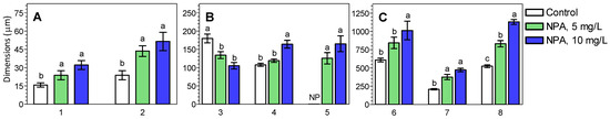 Results of measurements of different parts of the M. armeniacum root whose bulbs were kept in water or aqueous NPA solutions. Description of measured part of root: (A): 1—Thickness of cortex cell; 2—Thickness of the rhizodermis/epiblema; (B): 3—Cap thickness; 4—Width of stele; 5—Length of root hairs; NP means not present; (C): 6—Thickness of growth cap; 7—Width of cortex; 8—Root thickness. The results (bars ± SD) of the measurements of the respective root parts marked with the same letter do not differ from each other at a significance level of p = 0.05 according to Duncan’s test.