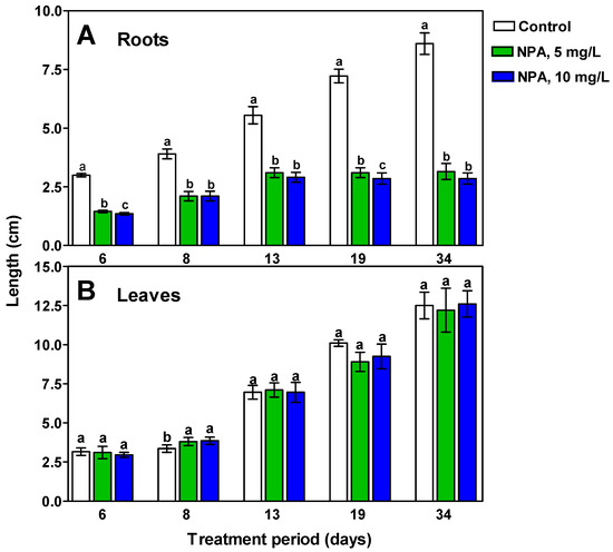 Results of root (A) and leaf (B) length measurements in M. armeniacum plants whose bulbs were kept in water or aqueous NPA solutions for the days indicated. Results (bars ± SD) on particular days of measurements marked with the same letter do not differ at a significance level of p = 0.05 according to Duncan’s test.