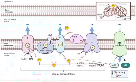 Mitochondria are the primary source of intracellular ROS. Under physiological conditions, they produce low levels of ROS that help regulate oxygen sensing, redox homeostasis, and the vascular tone. However, impaired mitochondrial function leads to excessive ROS generation, disrupting electron transport, damaging mitochondrial membranes, and triggering apoptosis [,,,]. However, when mitochondrial function is impaired, ROS production increases significantly, leading to higher levels than typically seen in physiological conditions []. This excess ROS production is caused by impaired electron transport chain (ETC) complexes [,,], which are responsible for oxygen consumption and the production of water in the mitochondria. The accumulation of ROS impairs the electron transport chain’s ability to support efficient respiration, leading to mitochondrial damage (Figure 1). This accumulation of mitochondrial (mt) ROS production can damage the respiratory chain, cause membrane lipid peroxidation, and release of cytochrome c, thereby leading to the initiation of apoptotic pathways and ultimately causing cell death [,]. In conditions like PCOS and PE, where oxidative stress and mitochondrial dysfunction are prevalent, this increased ROS production may contribute to organ damage and dysfunction []. Our group has contributed to elucidating the role of oxidative stress and mitochondrial dysfunction in the pathophysiology of PCOS [,] and PE [,,,,]. Building on this foundation, this review advances a novel interpretation that the immune system’s modulation of mitochondrial health through T cell activation, cytokine signaling, and NK cell engagement may act as a central driver of organ-specific dysfunction in both disorders. This perspective offers a new insight into the role of mitochondrial-targeted therapies, not merely as antioxidant strategies, but as modulators of immune–metabolic crosstalk.