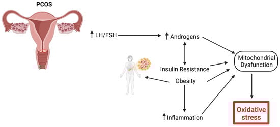 As outlined in Figure 3, hormonal dysregulation is central to PCOS. Women with PCOS exhibit the increased secretion of luteinizing hormone (LH) relative to follicle-stimulating hormone (FSH), resulting in elevated androgen levels []. Insulin resistance (IR) is another hallmark of PCOS, exacerbating hyperandrogenism and contributing to metabolic disturbances, such as obesity, dyslipidemia, and an increased risk of type 2 diabetes mellitus (T2M) [,]. Additionally, PCOS is associated with low-grade chronic inflammation and increased oxidative stress, which contributes to its pathophysiology and long-term cardiovascular risks [].