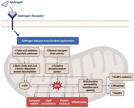 While mitochondrial dysfunction has been increasingly implicated in PCOS pathophysiology, involving granulosa cell integrity, metabolic substrate handling and inflammatory priming may predispose women with PCOS to adverse pregnancy outcomes. This review is among the first to explore these mitochondrial perturbations with the immunologic landscape of PE, drawing new parallels that may inform integrated therapeutic targets []. Recent research highlights altered mitochondrial function in multiple tissues, including the skeletal muscle, adipose tissue, and ovarian cells, contributing to the metabolic and reproductive abnormalities seen in PCOS []. In a study by Cree-Green and colleagues, obese girls with PCOS had a distinct metabolic signature during fasting and hyperinsulinemia []. Moreover, women with PCOS have a uniquely decreased fasting short-, medium-, and long-chain acylcarnitine, as well as insulin-stimulated valine breakdown products []. In PCOS, mitochondria play a crucial role in energy production, steroidogenesis, and the regulation of reactive oxygen species (ROS). Evidence suggests that androgen levels induce changes in metabolism, potentially impairing substrate utilization and energy production []. These findings suggest that testosterone may impair mitochondrial substrate handling, contributing to the metabolic abnormalities observed in PCOS (Figure 4).