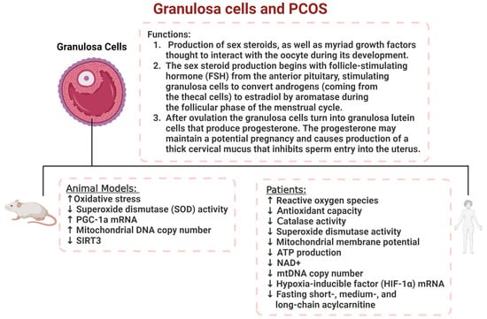 - Gao, Y.; Zou, Y.; Wu, G.; Zheng, L. Oxidative stress and mitochondrial dysfunction of granulosa cells in polycystic ovarian syndrome. Front. Med. 2023, 10, 1193749. [Google Scholar] [CrossRef]