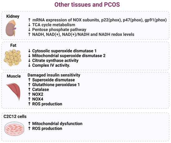 Oxidative stress and decreased antioxidant parameters in PCOS are correlated with hypertension, hyperinsulinemia, and dyslipidemia and, therefore, may contribute to metabolic syndrome and cardiovascular disease. A study by Yao et al. found increased superoxide dismutase, glutathione peroxidase 1, catalase, NOX2, NOX4, ROS production, and damaged insulin sensitivity in the skeletal muscles of mice with PCOS []. Using a mouse skeletal muscle cell line, C2C12 cells, these authors also found that high levels of testosterone caused mitochondrial dysfunction and increased ROS levels through the androgen receptor (AR)–nicotinamide adenine dinucleotide phosphate oxidase 4 (NOX4) signaling pathway []. However, the treatment of C2C12 cells with an antioxidant N-acetylcysteine (NAC) decreased androgen-induced ROS production, improved mitochondrial function, and reversed insulin resistance []. The administration of the antioxidant N-acetylcysteine (NAC) to mice with PCOS was also shown to improve insulin sensitivity in the skeletal muscles of the animals []. In another study, Yanes, et al. used the dihydrotestosterone (DHT)-treated rat model of PCOS and found that the mRNA expression levels of NOX subunits, p22(phox), p47(phox), gp91(phox), and NOX4 were all upregulated in the kidneys compared to control females []; however, mitochondrial function was also not measured in this study.