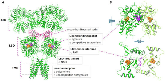 Structurally, PAMs bind at the LBD–dimer interface with one or two molecules (Figure 1), resulting in the stabilization of the agonist-bound receptor conformation, slowing down ion channel deactivation, and reducing the rate of desensitization [13,15,16,17,18]. According to Ptak et al., at least five overlapping binding subsites can be distinguished on the binding surface for PAMs: one central subsite and two pairs of symmetrical sites located on adjacent monomers [13,16].