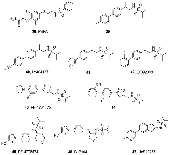 The sulfonamide-structured analogs described in this section represent the third major group among the chemotypes of positive allosteric modulators of AMPA receptors, which are structurally characterized by the presence of an alkyl-substituted sulfonamide group with a sulfur atom not incorporated in the ring system. One of the first compounds developed in this group is PEPA (38, Figure 5), which was found to be at least 100 times more potent for the amplification of glutamate responses at GluA3o than aniracetam. PEPA preferentially potentiated flop isoforms (compared to flip variants) with a selectivity profile similar to aniracetam, in contrast to cyclothiazide, which is flip-selective [106]. As shown in X-ray studies of PEPA in complex with GluA2o and GluA3o (PDB ID 3M3L, 3M3F), the preference for the flop isoform can be explained by the formation of a hydrogen bond between the amide group in PEPA and the asparagine residue N754, which is replaced by serine in the flip variant [17].