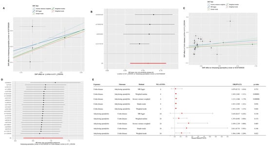 Bidirectional Mendelian randomization (MR) analysis between Crohn’s disease (CD) and ankylosing spondylitis (AS). (A) Scatterplot of SNP effect sizes for CD (exposure) and AS (outcome) using five MR methods: inverse variance weighted (IVW), MR-Egger, weighted median, simple mode, and weighted mode. (B) MR leave-one-out sensitivity test for CD on AS. (C) Scatterplot of SNP effect sizes for AS (exposure) and CD (outcome) using the same MR methods. (D) MR leave-one-out sensitivity test for AS on CD. (E) Forest plot of odds ratios (ORs) and 95% confidence intervals (CIs) for the causal relationships between CD and AS using different MR methods. Four SNPs were used for CD and 24 SNPs for AS.
