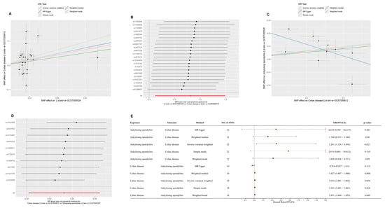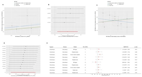 Bidirectional Mendelian randomization (MR) analysis between Crohn’s disease (CD) and celiac disease (CeD). (A) Scatterplot of SNP effect sizes for CD (exposure) and CeD (outcome) using five MR methods: inverse variance weighted (IVW), MR-Egger, weighted median, simple mode, and weighted mode. (B) MR leave-one-out sensitivity test for CD on CeD. (C) Scatterplot of SNP effect sizes for CeD (exposure) and CD (outcome) using the same MR methods. (D) MR leave-one-out sensitivity test for CeD on CD. (E) Forest plot of odds ratios (ORs) and 95% confidence intervals (CIs) for the causal relationships between CD and CeD using different MR methods. Four SNPs were used for CD and 12 SNPs for CeD.