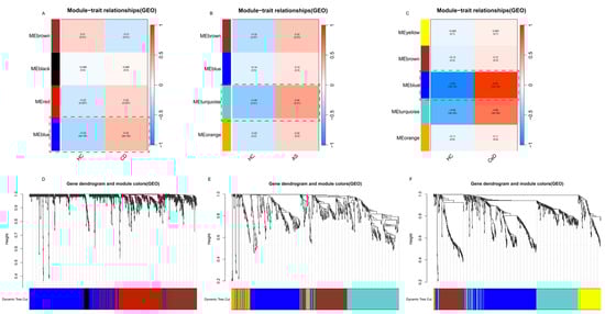 We then applied weighted gene co-expression network analysis (WGCNA) to each dataset to identify co-expression modules and key regulatory genes. We conducted WGCNA on the CD dataset (GSE207022), the CeD dataset (GSE112102), and the AS dataset (GSE25101) to identify common genes influencing these diseases. The sample clustering dendrogram and scale-free topology model fitting and mean connectivity plots for the three diseases are shown in Supplementary File S4. Using this method, four, four, and five co-expression modules were identified for each disease (Figure 6A–C), with the blue module in GSE207022, the turquoise module in GSE112102, and the blue module in GSE25101 demonstrating the strongest correlation with disease onset. Therefore, these three modules were chosen for additional analysis.