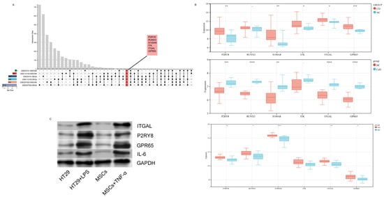 Identification and validation of overlapping hub genes in Crohn’s disease (CD), ankylosing spondylitis (AS), and celiac disease (CeD). (A) Upset plot showing the overlap of differentially expressed genes (DEGs) and key weighted gene co-expression network analysis (WGCNA) modules across CD, AS, and CeD datasets. Six hub genes (P2RY8, RUNX3, S100A8, ITK, ITGAL, and GPR65) were identified as shared among all three diseases. (B) Boxplots of the expression levels of the six hub genes in CD, AS, and CeD compared to healthy controls (HC). Red represents disease groups (CD, AS, or CeD), and blue represents healthy controls. p values indicate the statistical significance of differences in expression levels (* p < 0.05, ** p < 0.01, *** p < 0.001, **** p < 0.0001). (C) Western blot analysis of protein ITGAL, P2RY8, GPR65, and IL-6 of HT29 and MSCs in different conditions.