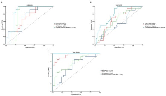Receiver operating characteristic (ROC) curves for the diagnostic performance of hub genes in Crohn’s disease (CD), ankylosing spondylitis (AS), and celiac disease (CeD). (A) ROC curve for P2RY8, ITGAL, and GPR65 in the GSE95095 dataset (CD), showing the area under the curve (AUC) values for each gene and the combined predictive model. (B) ROC curve for the same hub genes in the GSE73754 dataset (AS), with AUC values for individual genes and the combined model. (C) ROC curve for hub gene performance in the GSE164883 dataset (CeD), with AUC values for each gene and the combined predictive model. The combined predictive model demonstrated higher diagnostic accuracy across all datasets.
