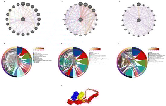 We utilized the GeneMANIA database to analyze the co-expression network of these three genes, uncovering a complex protein-protein interaction (PPI) network (Figure 9A–C). GO analysis indicated that these genes are primarily associated with immune response, immune system regulation, and immune-related processes within the biological process category (Figure 9D). Regarding cellular components, the genes demonstrated enrichment in parts of the plasma membrane, the cell surface, and intrinsic membrane components (Figure 9E). Lastly, for molecular function, the genes were predominantly enriched in receptor signaling activity, molecular transduction activities, and transmembrane receptor signaling functions (Figure 9F). AlphaFold software (2024.10.30) was subsequently employed to model the structures of the proteins encoded by these genes and predict their interactions (Figure 9G). The predicted structures of the three proteins are presented in Supplementary File S5.