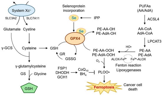 In addition to its enzymatic detoxification function, GPX4 protects against ferroptosis by limiting the formation of reactive lipid species catalyzed by iron [40]. Cellular iron homeostasis is tightly controlled by the labile iron pool (LIP), transferrin receptor 1 (TFRC), ferritin, and ferroportin (FPN1) [41]. Under ferroptotic conditions, iron-catalyzed Fenton reactions convert hydrogen peroxide into hydroxyl radicals, which initiate lipid peroxidation cascades, particularly in membranes enriched in arachidonic acid (AA) and adrenic acid (AdA) [25,42]. Enzymatic lipid peroxidation is further facilitated by acyl-CoA synthetase long-chain family member 4 (ACSL4), which esterifies AA/AdA into phosphatidylethanolamines (PEs), making them substrates for oxidation by lipoxygenases (ALOX15, ALOX12) [43,44]. In this context, GPX4 functions as the final checkpoint in detoxifying oxidized PEs (PE-AA-OOH), thereby halting ferroptotic execution.