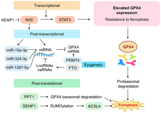 - Cui, C.; Yang, F.; Li, Q. Post-Translational Modification of GPX4 is a Promising Target for Treating Ferroptosis-Related Diseases. Front. Mol. Biosci. 2022, 9, 901565. [Google Scholar] [CrossRef]