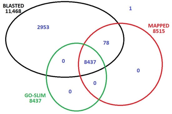 The processed reads were mapped to the G. max reference genome (GCF_000004515.6) obtained from NCBI on 11 November 2024. Bowtie2 was applied for read alignment. The reads that matched the reference genome CDS were retained for further analysis. The CDS sequences were reannotated, including Blastx alignment, Gene Ontology (GO) mapping, GO annotation, and functional analysis (GO-Slim). Blast alignments were performed against the NR database (version dated 23 January 2025), utilizing the taxonomic filters for Viridiplantae (NCBI:txid33090). This mapping was automated using OmicsBox (Bioinformatics Made Easy, BioBam Bioinformatics, https://www.biobam.com/omicsbox, accessed on 3 January 2025).