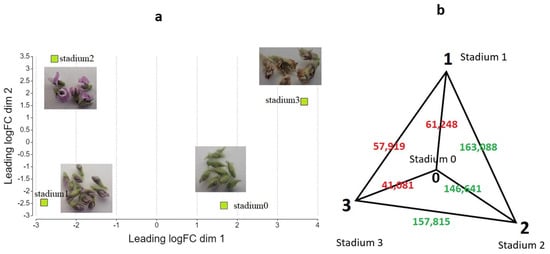 The substantial number of DEGs identified across the developmental stadiums of soybean flowers reflects a dynamic reprogramming of transcriptional activity during floral maturation. The highest number of DEGs was observed in the comparison between Stadium 1 and Stadium 0, suggesting that the early phase of flower development involves the most dramatic transcriptional shifts. This is consistent with the initiation of key developmental and morphogenetic processes that likely require extensive gene activation and repression [,].
