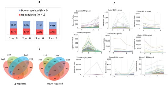 Pairwise expression analysis and time-course expression analysis of DEGs during soybean flower maturation. Diagram (a) shows the up- and downregulated DEG number changes across the four analyzed sample pairs. An M-value greater than 0, calculated as M = log2 (Expression in condition 1/Expression in condition 2), indicates that the gene is more highly expressed in condition 1 compared to condition 2 in the pairwise comparison. Venn diagram (b) illustrates the overlap and specificity of differentially upregulated and downregulated genes across the developmental stadium comparisons. Image (c) displays the clustered gene expression patterns. The clustered gene groups are represented in different colors in the pictures of Cluster 1–9.